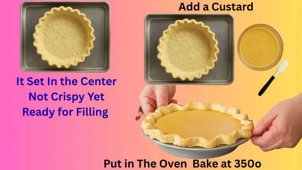 my pie is needs go back in the oven for 8 to 10 minutes we want it to get nice and lightly golden brown before we put our filling in after 10 minutes we got a lightly brown on it. It is set in the center and that’s what we want not crispy yet ready for our filling whenever I bake pie I like to put it on a street tray this will avoid any spill over from burning to the bottom of my oven
